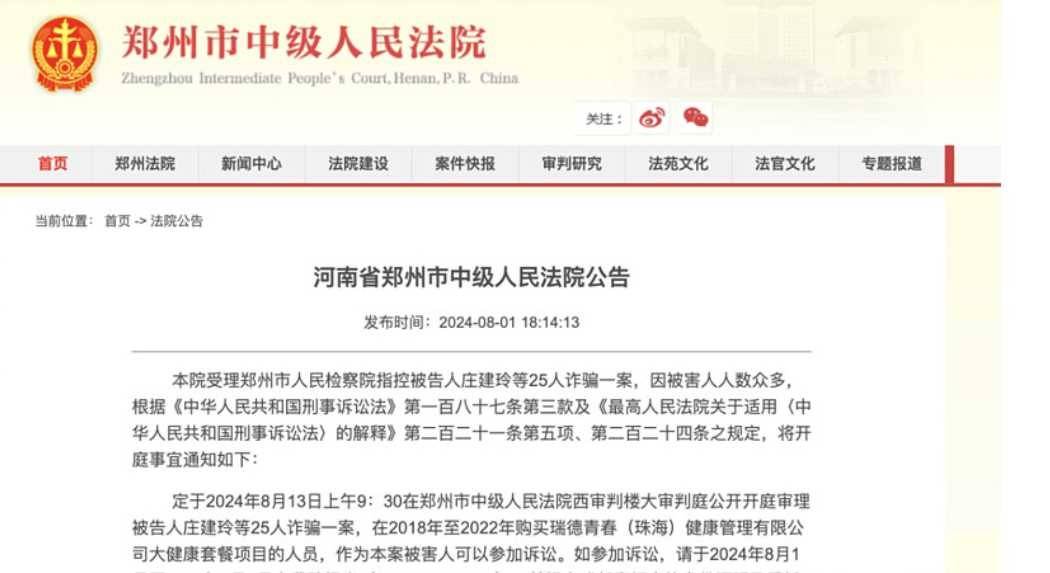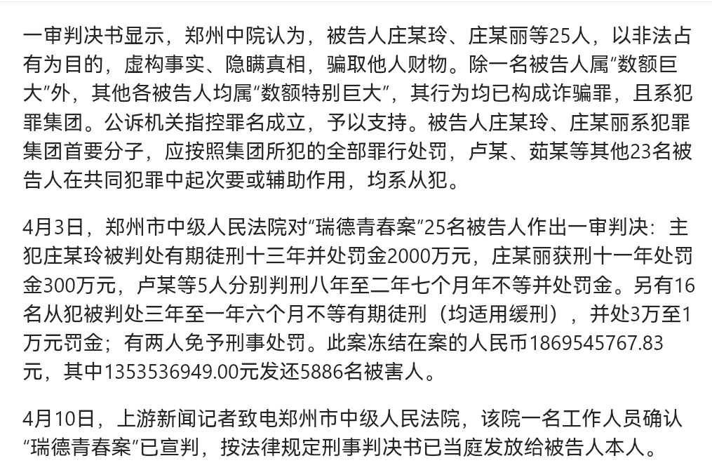 今年4月,郑州市中级人民法院对“瑞德青春案”25名被告人作出一审判决:主犯庄某玲被判处有期徒刑十三年并处罚金2000万元,庄某丽获刑十一年处罚金300万元,卢某等5人分别判刑八年至二年七个月不等并处罚金。另有16名从犯被判处三年至一年六个月不等有期徒刑(均适用缓刑),并处3万至1万元罚金;有两人免予刑事处罚。此案法院冻结在案资金约18.7亿元,其中13.5亿元将依法发还5886名受害人。该判决结果与消费者投诉中反映的经营模式存在高度关联性。