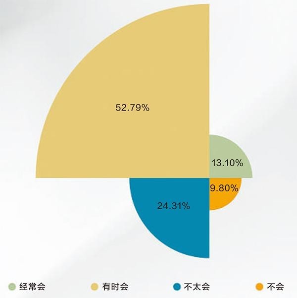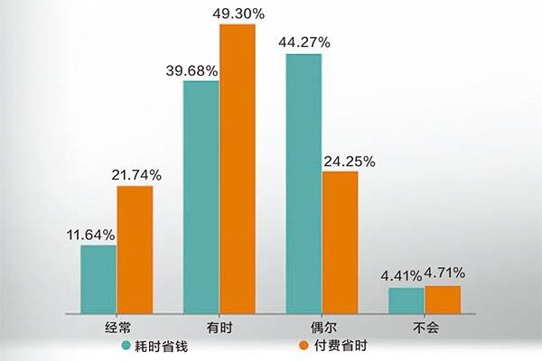 中青校媒调查显示,95.59%受访者会花时间研究如何省钱,11.64%受访者会花很多时间,39.68%受访者会花较多时间,44.27%受访者会花较少时间。受访者省钱的方式包括和朋友拼单、分摊会员(45.93%),在线上、线下不同平台或店铺货比三家(42.44%)等。与此同时,95.29%受访者会为省时而花钱,21.74%受访者经常会,49.30%受访者有时会,24.25%受访者偶尔会。他们省时的操作包括购买视频网站免广告会员(37.78%)、选择外卖优先配送(32.76%)、快递上门取件(30.50%)等。